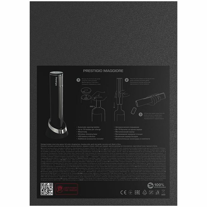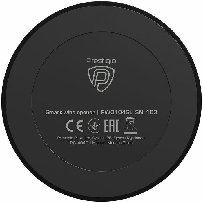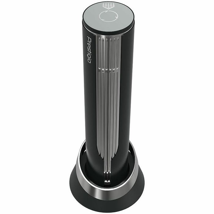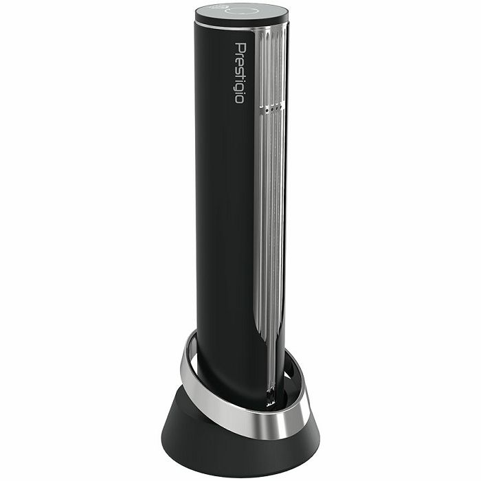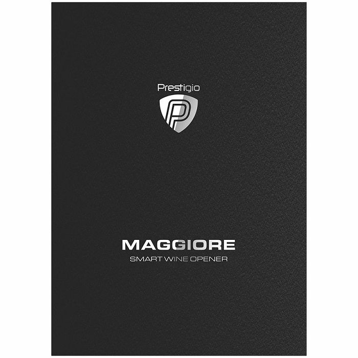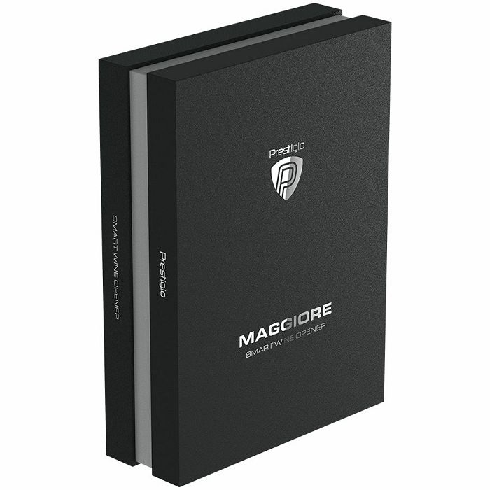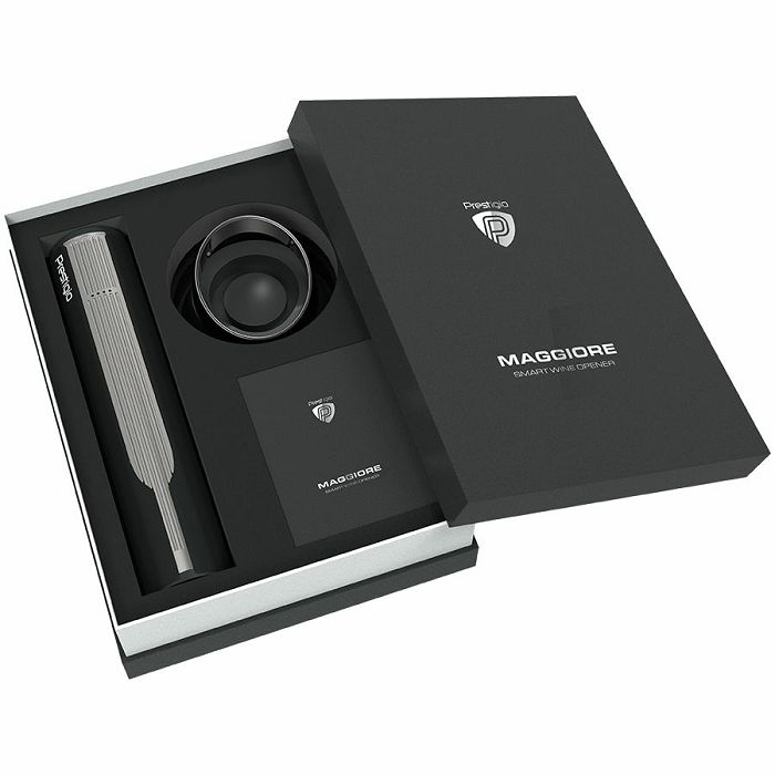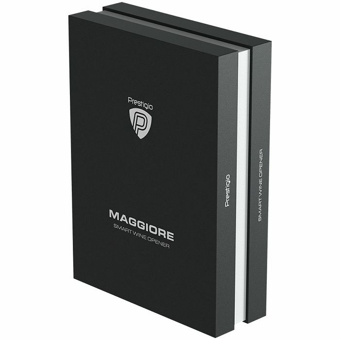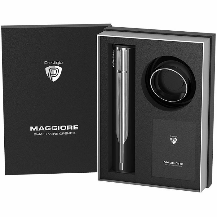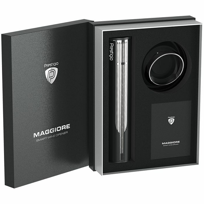 Prestigio Maggiore, smart wine opener, 100% automatic, opens up to 70 bottles without recharging, foil cutter included, premium design, 480mAh battery, Dimensions D 48*H228mm, black + silver color.